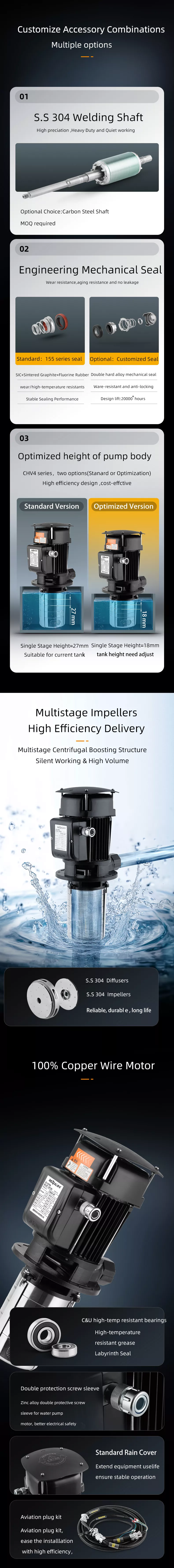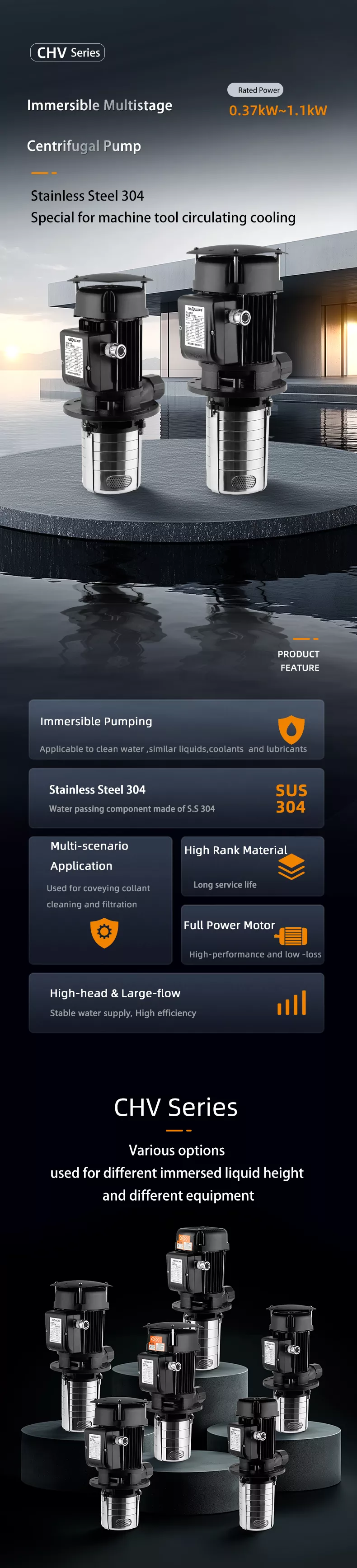Төменде CHV сериясын енгізу, әсіресе Chv Multriful Multrifugal сорғысы, әсіресе салқындатуға арналған майлы центрифугациялық сорғы, әсіресе станоктарға арналған салқындатуға арналған, және сорғы стерекімен сорғы десктерінің үстіңгі жағына орнатылады. Баспалдақтар SBK сорғылары әр түрлі сорғы өлшемдерінде және ағынды, қысым мен ұзындығын қамтамасыз ету үшін әр түрлі кезеңдерден тұрады.
